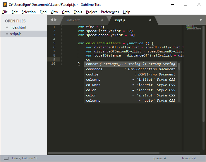 - Sublime Text предлагает варианты завершения вводимого кода.